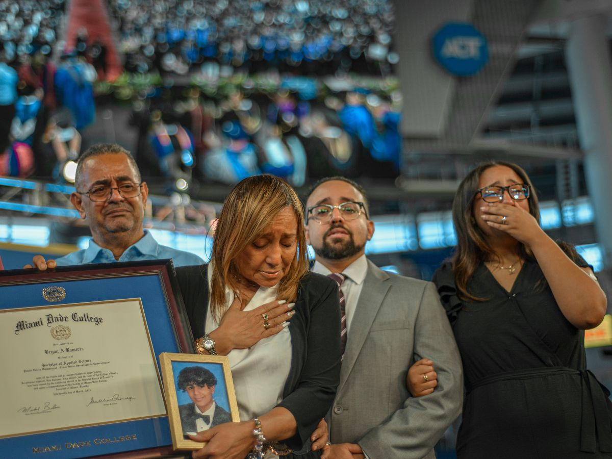 During the morning graduation, the parents of 21-year-old Bryan Alexander Ramirez, who lost his life in a car accident in June of 2025, received a posthumous bachelor of applied science degree during the North Campus ceremony. Ramirez’s mom, Alicia Del Carmen, clutched her heart and a photo of her son as the crowd greeted them with a standing ovation.