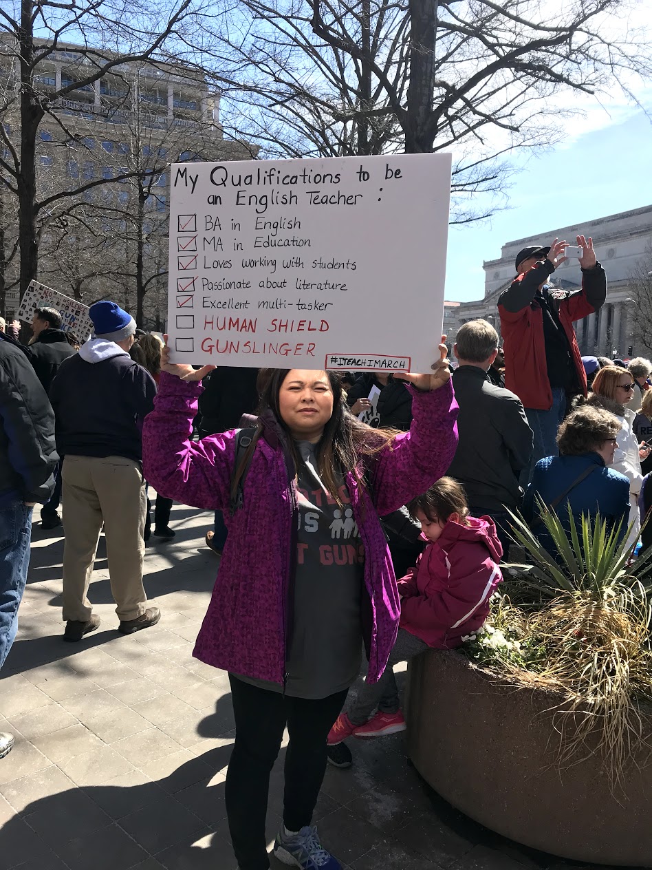 She held a poster listing what qualifications are required for her to be an English teacher. The list had checkmarks next to a bachelor’s degree in English, a master’s degree in English, loves working with students, passionate about literature and an excellent multi-tasker. The following two qualifications were listed in red capital letters alongside unchecked boxes: human shield, gunslinger. Garcia’s poster also said “#ITeachIMarch.”