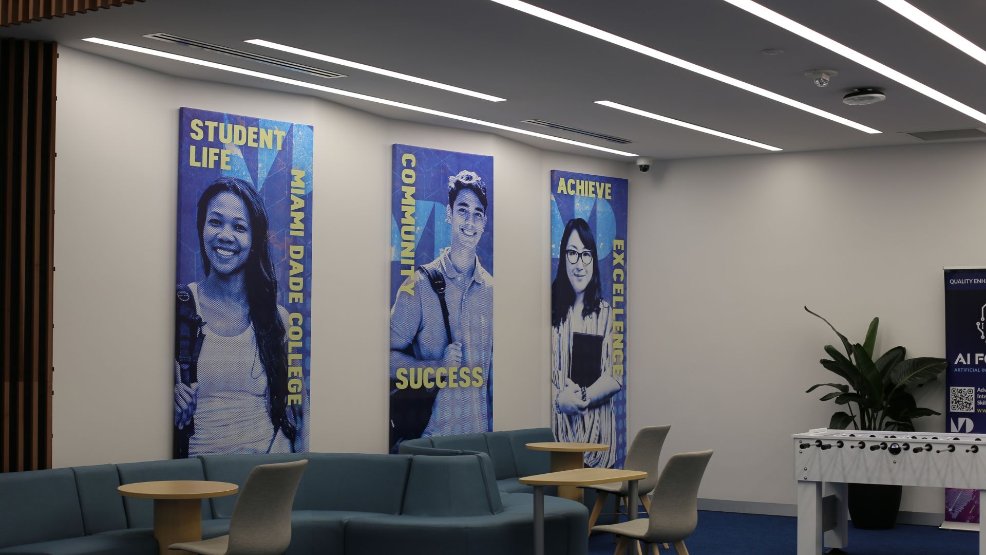 It has a game room with a foosball table, open study spaces, two conference rooms, a private meeting room, four offices and new technology, including three TVs and a ring light setup for social media clips.