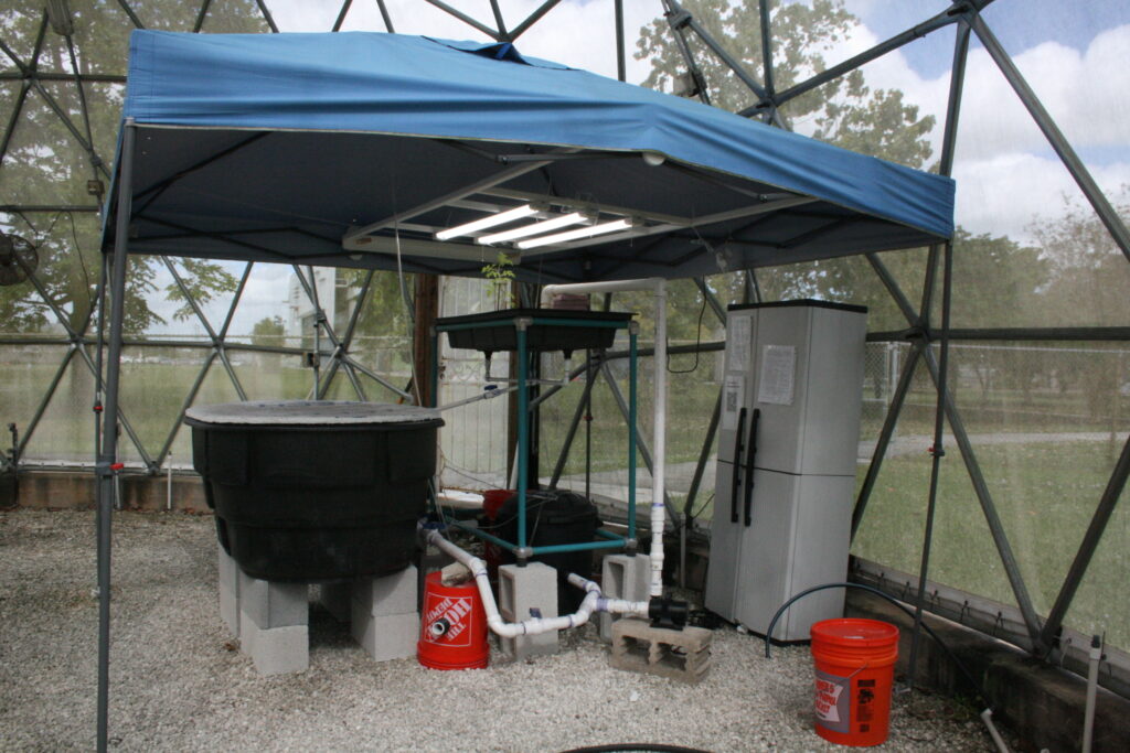 Seven tilapia are stored in a 150-gallon, styrofoam-covered tank with a pump that guides the water with fish excrement through filtration stages.