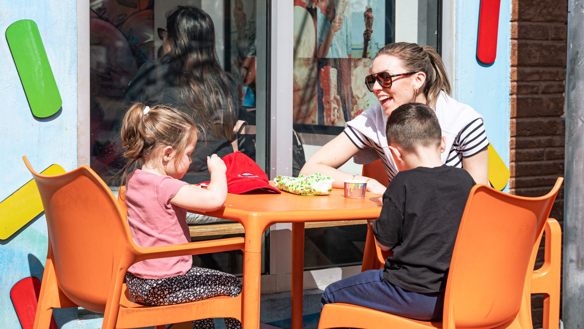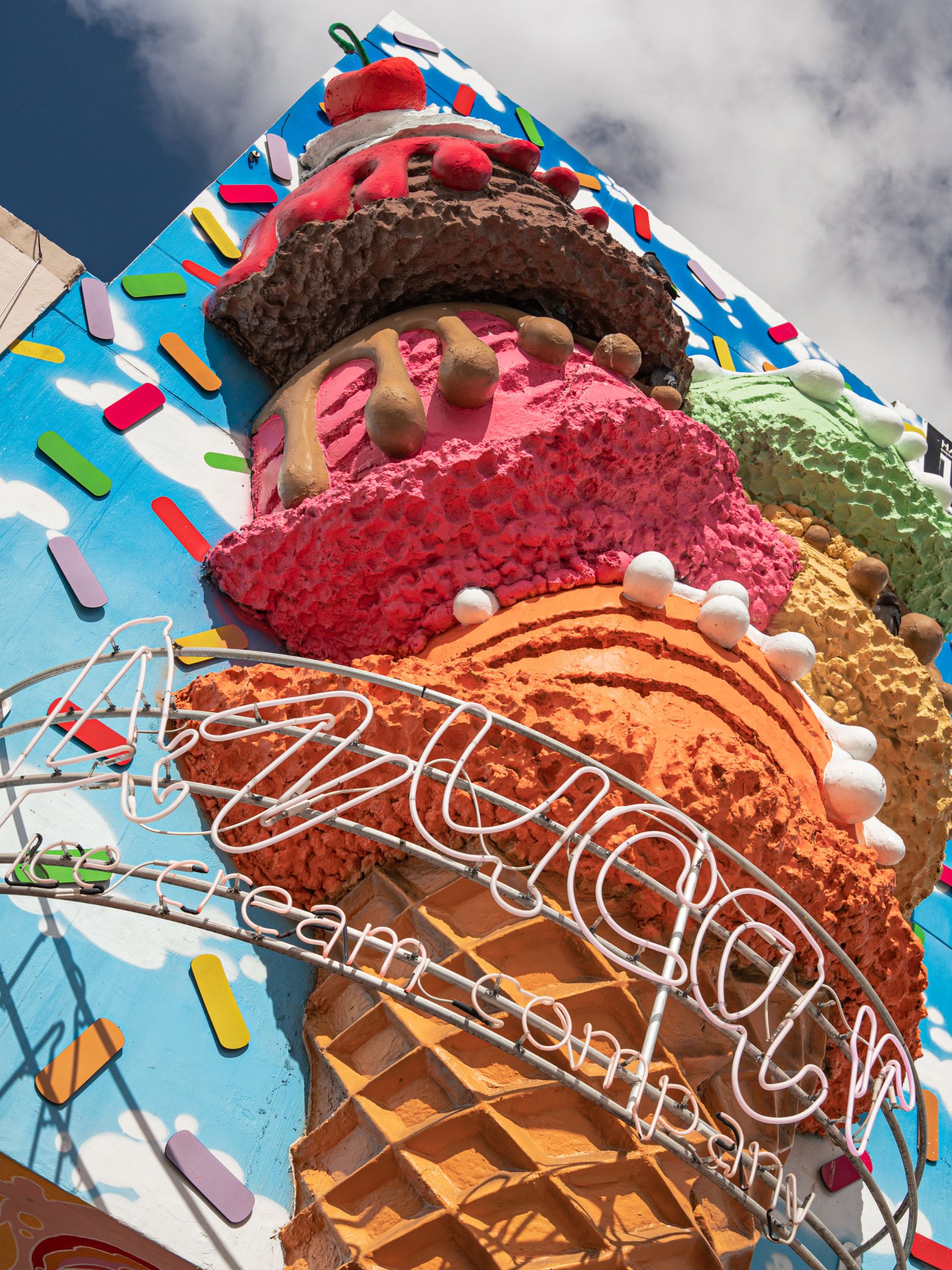 As customers enter the store, they are greeted by a 3-D ice cream cone sculpture topped with five scoops of ice cream and a neon sign that reads, “Azucar ice