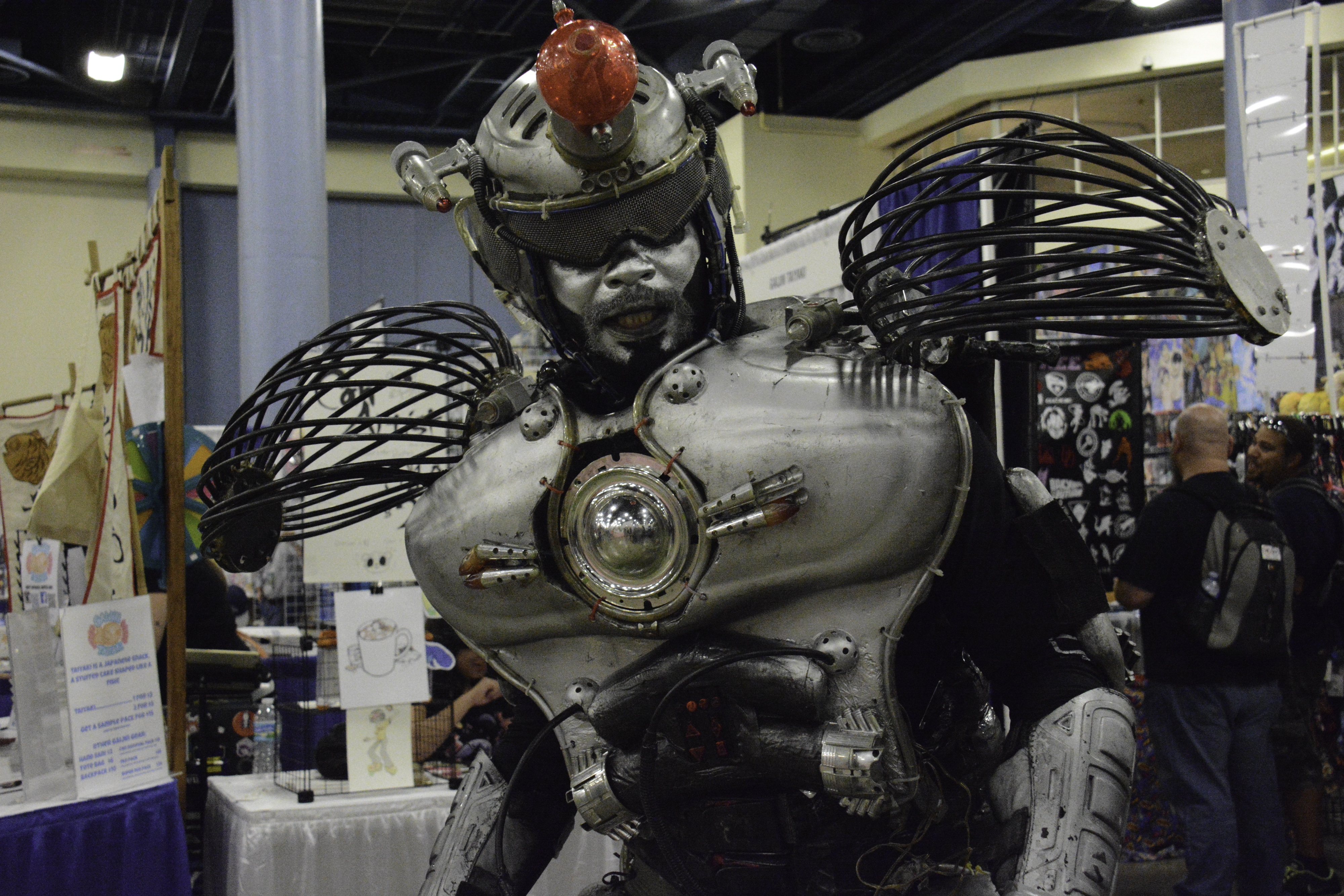 Crash and Burn: A cosplayer dressed up as Strobo from The Killer Robots! Crash and Burn gives the camera an intense glare on July 3 at Florida Supercon.