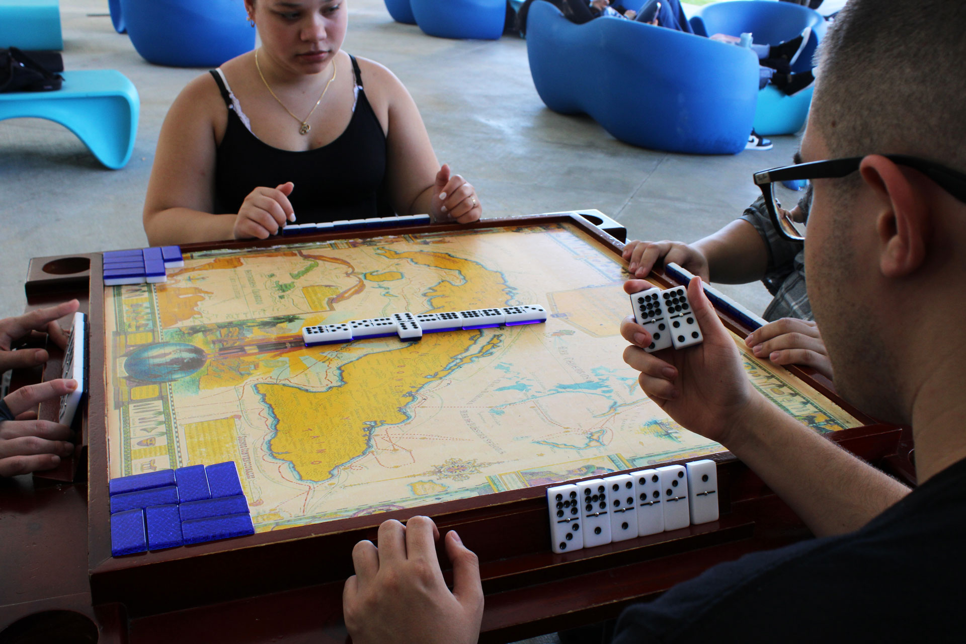 The group got more organized this semester when a student in Bestard’s algebra class brought his own dominoes set and they started improvising games in the courtyard near the cafe on campus.