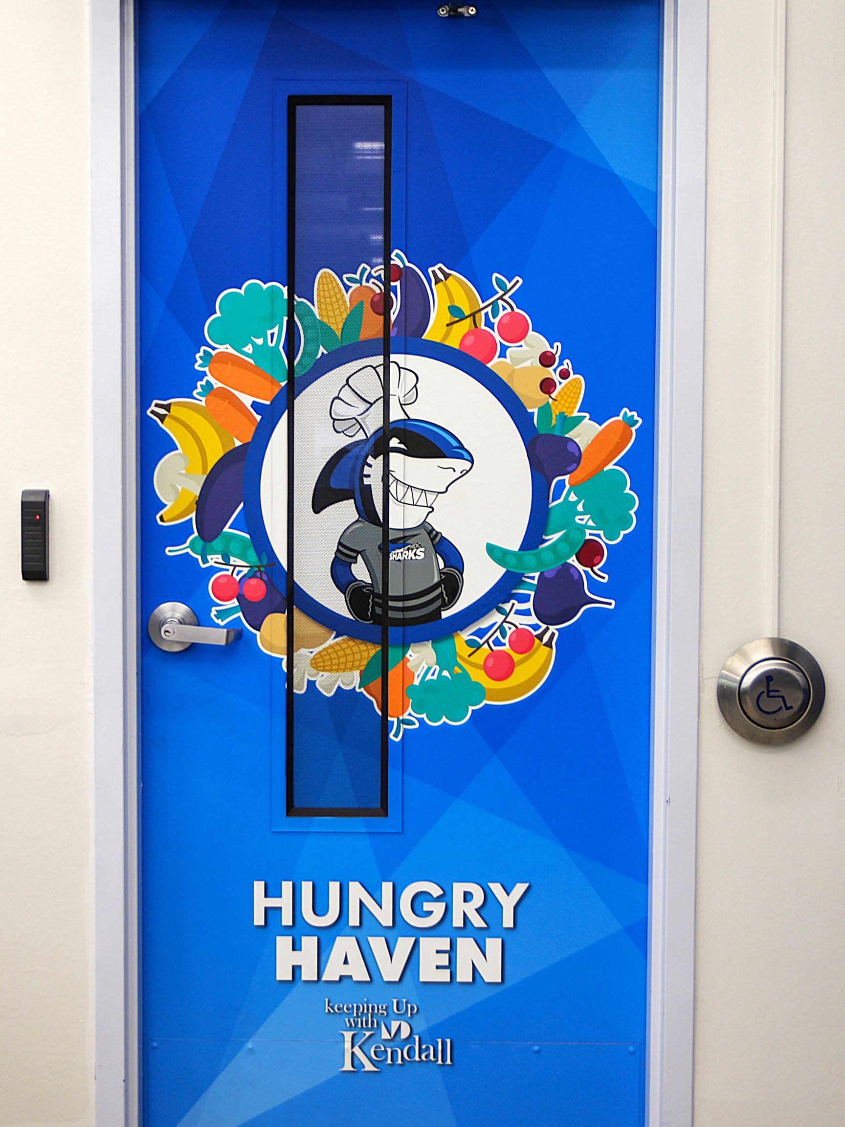 The pantry’s doors were branded with a blue decal that reads “Hungry Haven” and “Keeping Up With Kendall.”  Miami Dade College’s mascot, Finn, is pictured at center, sporting a chef’s hat and surrounded by fruits and vegetables.