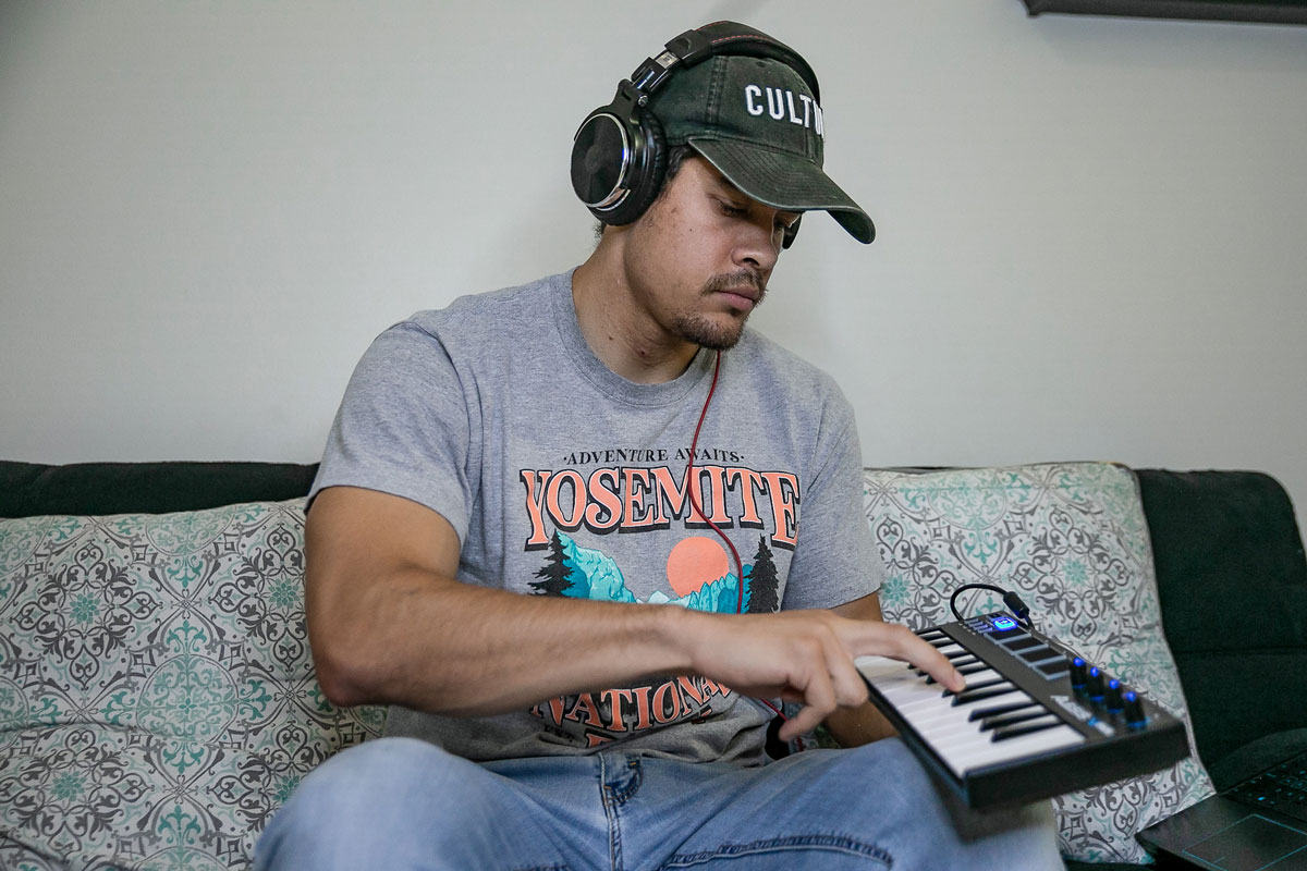 Sound Machine: Isaac Gomez is pictured here with a MIDI keyboard. Gomez, who recently released Ambitious Mortal, an extended play record, uses the instrument to upload sound to prepare for production. DANNA QUINTERO/THE REPORTER