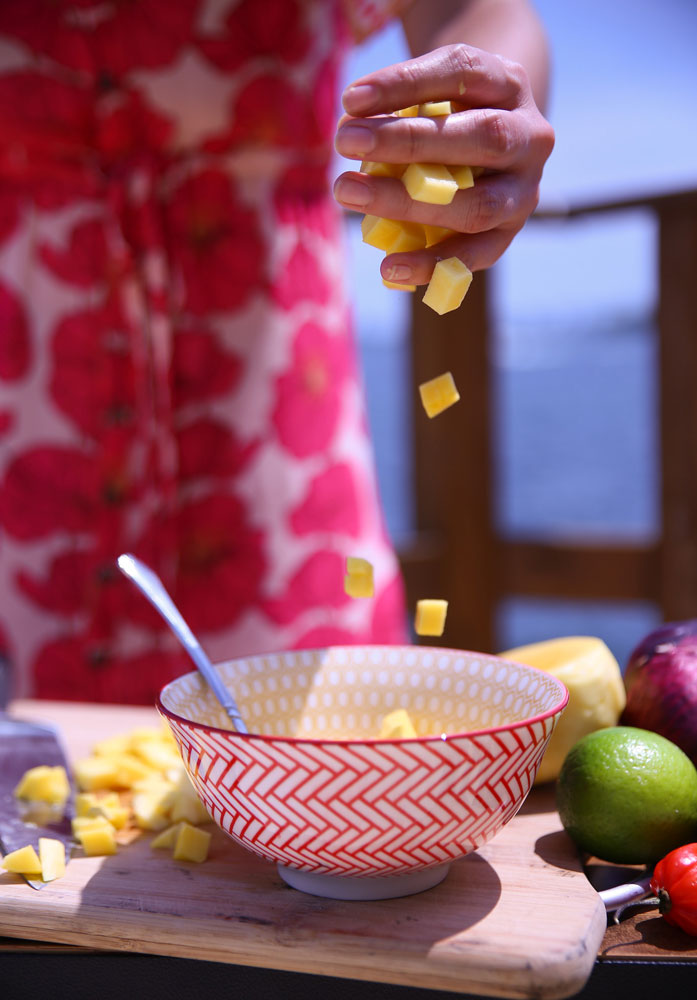 Chopped: Carmen Ibarra mixes some diced mangos in a bowl to prepare her Mango Mama Salsa. DANNA QUINTERO/THE REPORTER