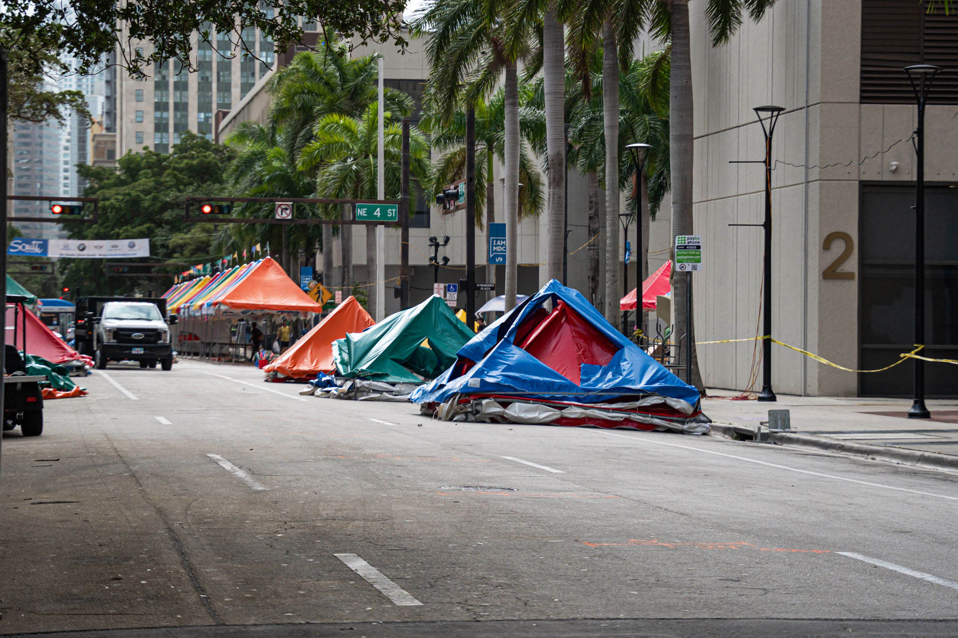 The storm wrecked more than 33 tents—between 4th and 5th Street along N.E. Second Avenue—that were adorned with thick vinyl covers and fortified by steel poles held in place by 45 pound bases.