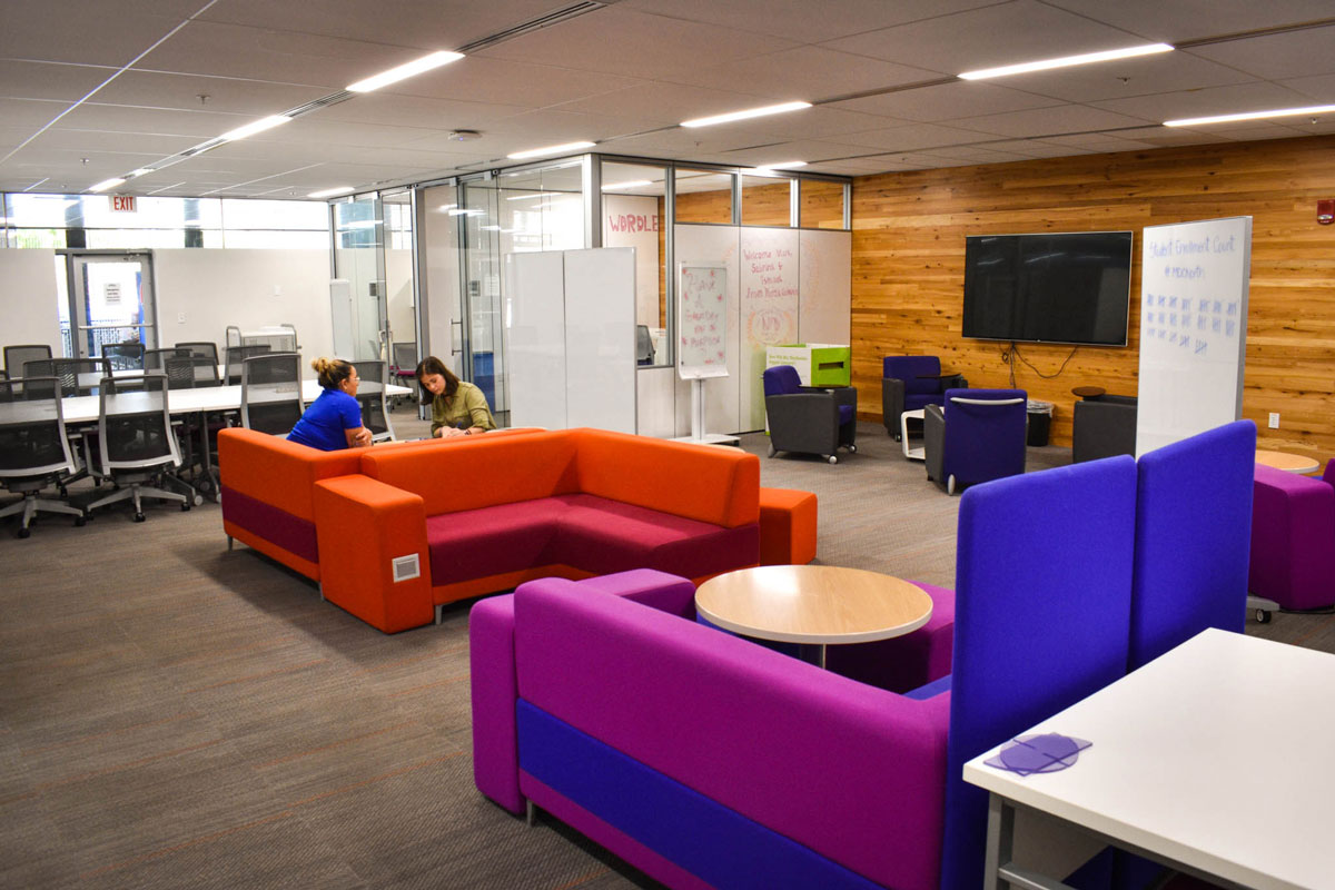 The room’s layout is built for collaboration. It features colorful couch-style seating, rectangular boardroom tables and a comfy armchair space.