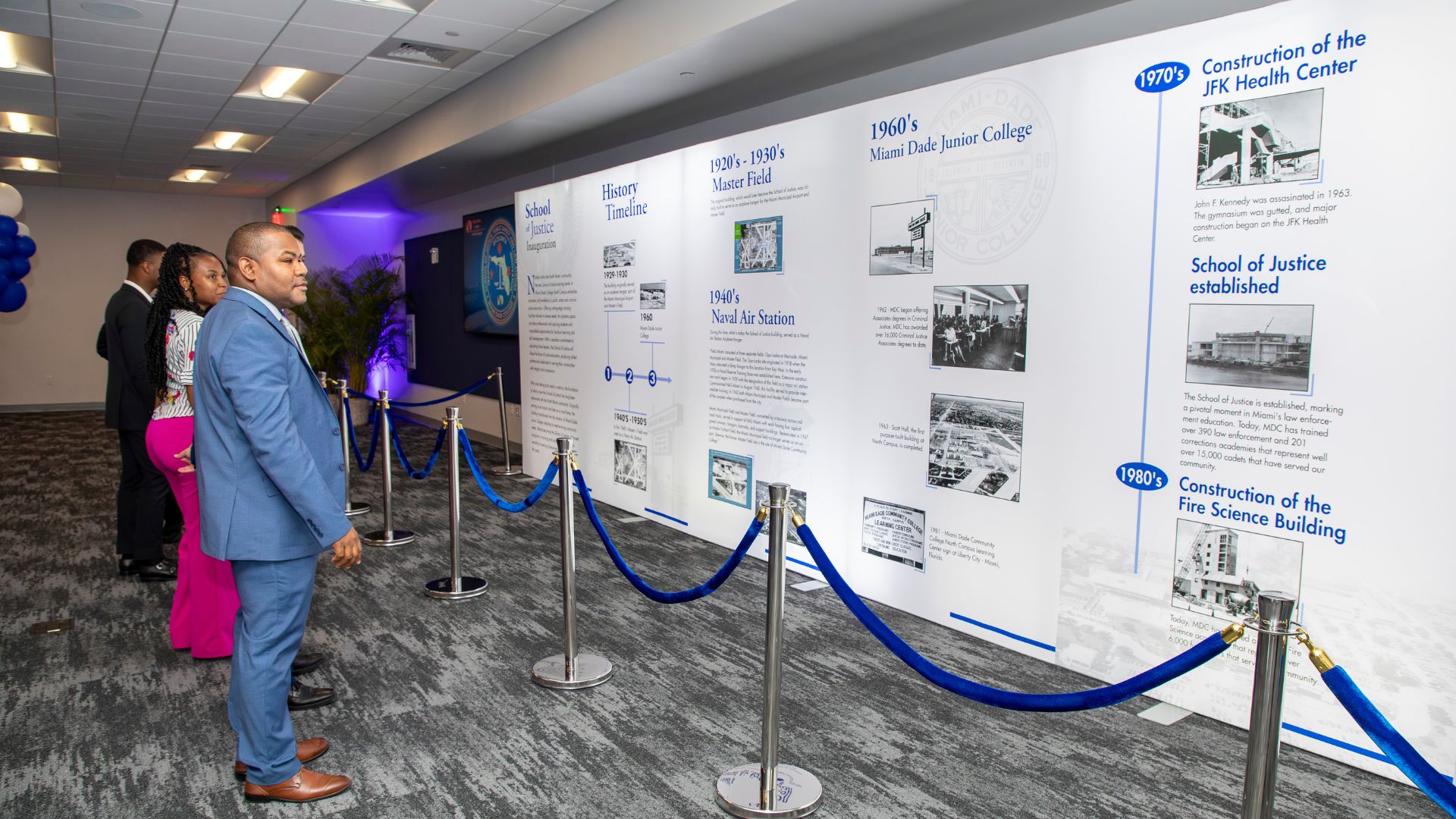 Rich History: Miguel Murphy, Miami Dade College’s executive director of enrollment management, reads about the School of Justice’s history. PHOTO COURTESY OF DANIELA CALDERON VIVAS/NORTH CAMPUS MEDIA SERVICES