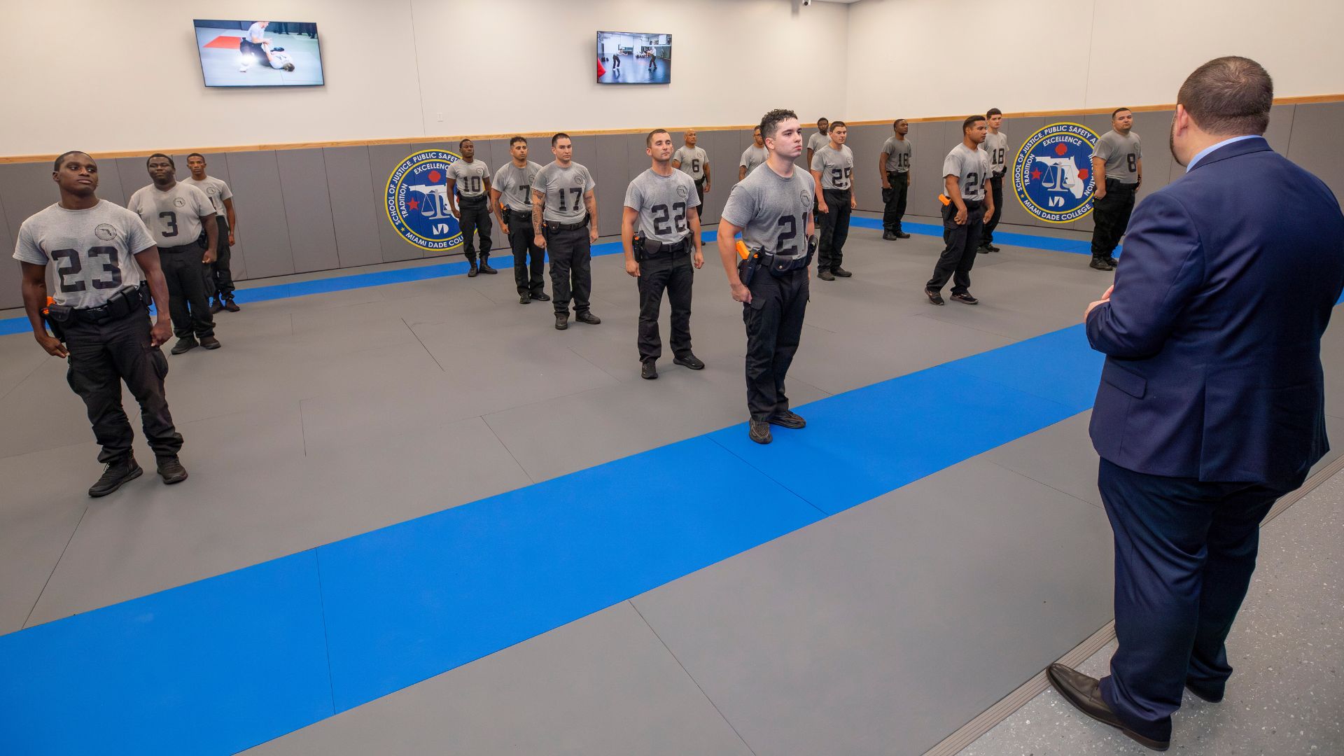The 120,000 square-foot facility, which has been in the works for a decade, features a 2,500 square-foot mock courtroom, a three-story rappelling tower, an emergency operations training center, a simulation room, eight classrooms, two tactical defense rooms and a training lab, which features retractable walls and a catwalk for instructors to oversee training.