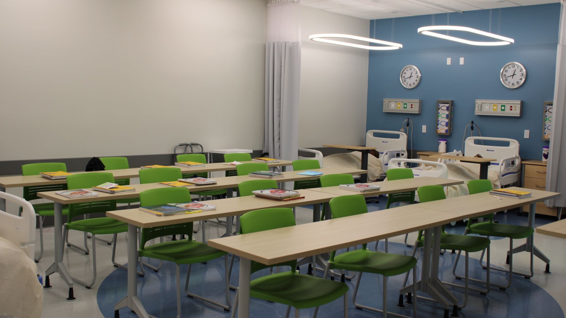 It includes four long tables at the center of the room, each seating four students and electric hospital beds on each corner, surrounded by a wrap-around curtain.