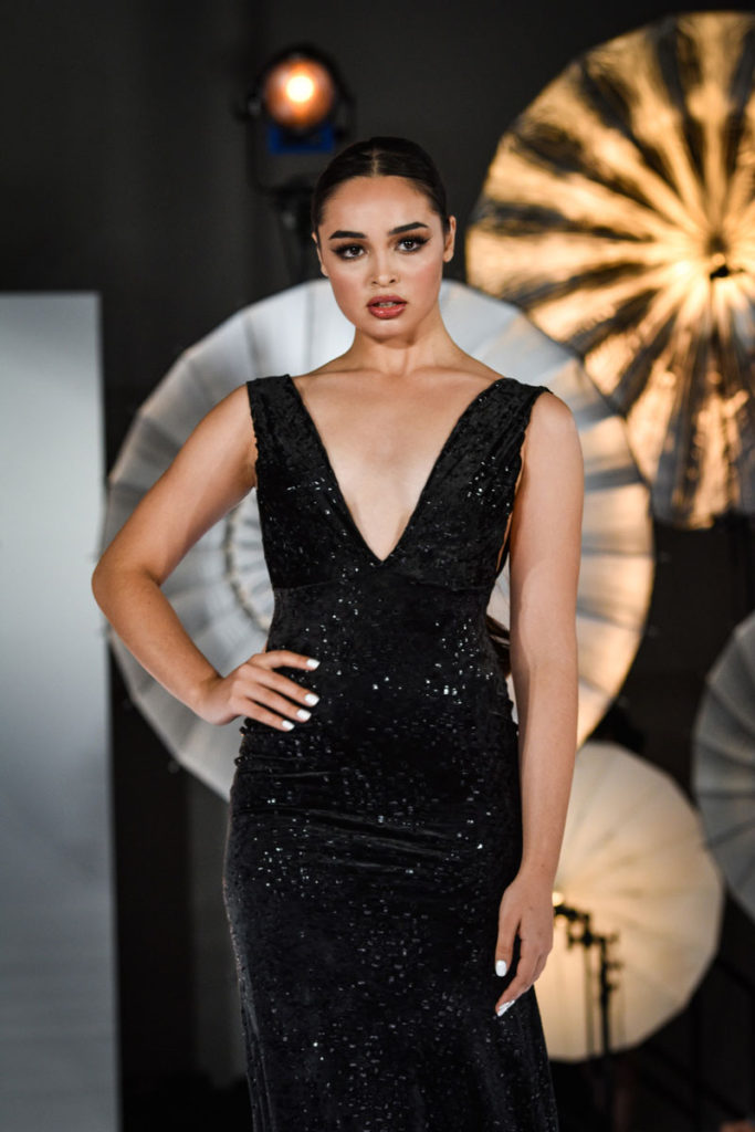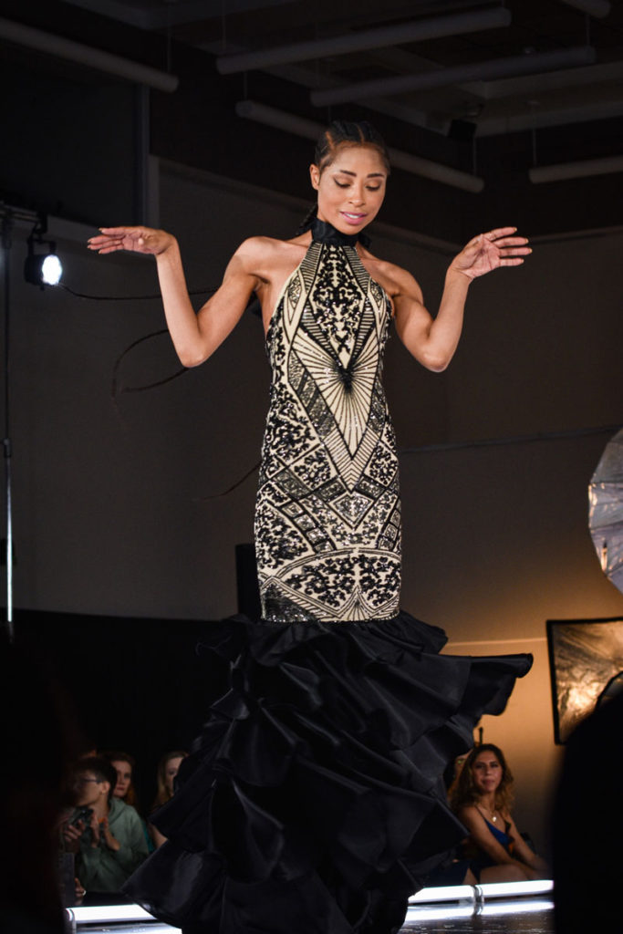 En Vogue: Model Medjine shows off one of Yas Gonzalez’s creations by spinning at the end of the runway. BRIANNA ACEVEDO / THE REPORTER