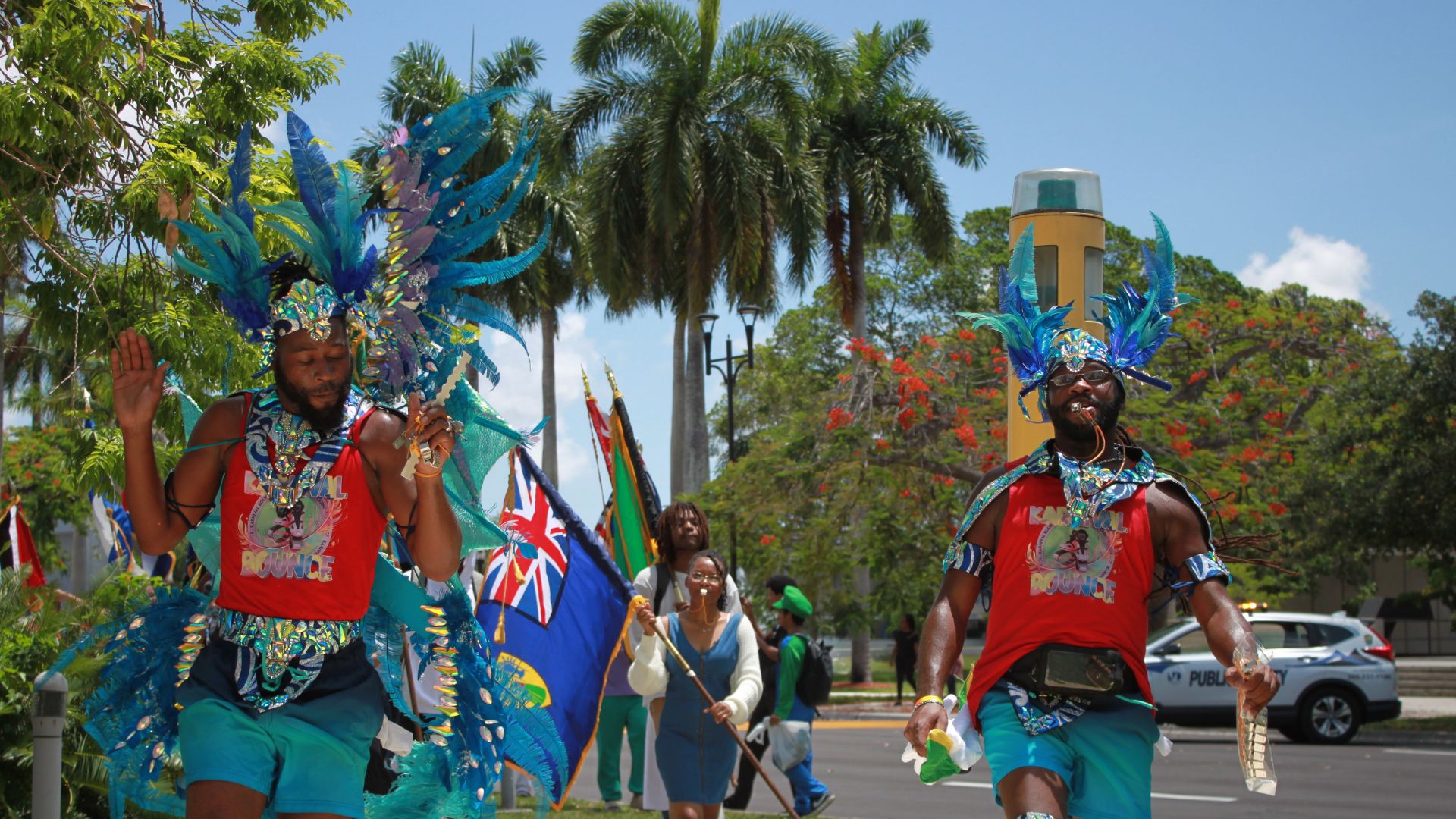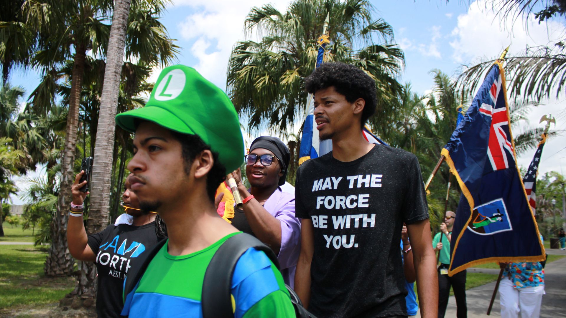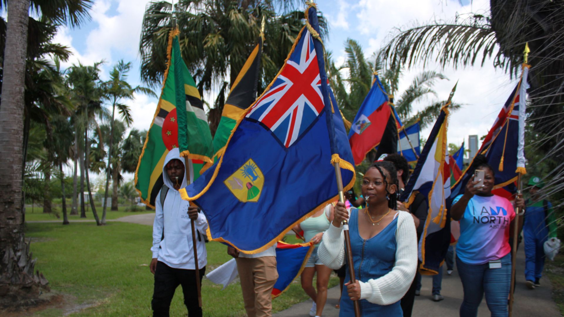 Marching On: A group of students hold flags that represent various Caribbean countries as they head toward the tiki hut located at the Palmetum. Some of the flags in the Caribbean Flag Parade included the British Virgin Islands, Haiti, Saint Kitts and Nevis and Dominica. GABRIELA SALGUERO/THE REPORTERSoaring High: A man carries the British Virgin Islands flag toward the tiki hut located at the Palmetum at North Campus on June 9. GABRIELA SALGUERO/THE REPORTERIn Unison: Students join in during the festivities of the Caribbean Flag Parade held at North Campus on June 9. The trek started in the building three atrium and ended at the tiki hut located at the Palmetum. GABRIELA SALGUERO/THE REPORTERFinal Destination: The Caribbean Flag Parade ended at the tiki hut located at the Palmetum at North Campus. Participants celebrated with music, dancing, and food like baked macaroni au gratin and chicken. GABRIELA SALGUERO/THE REPORTER