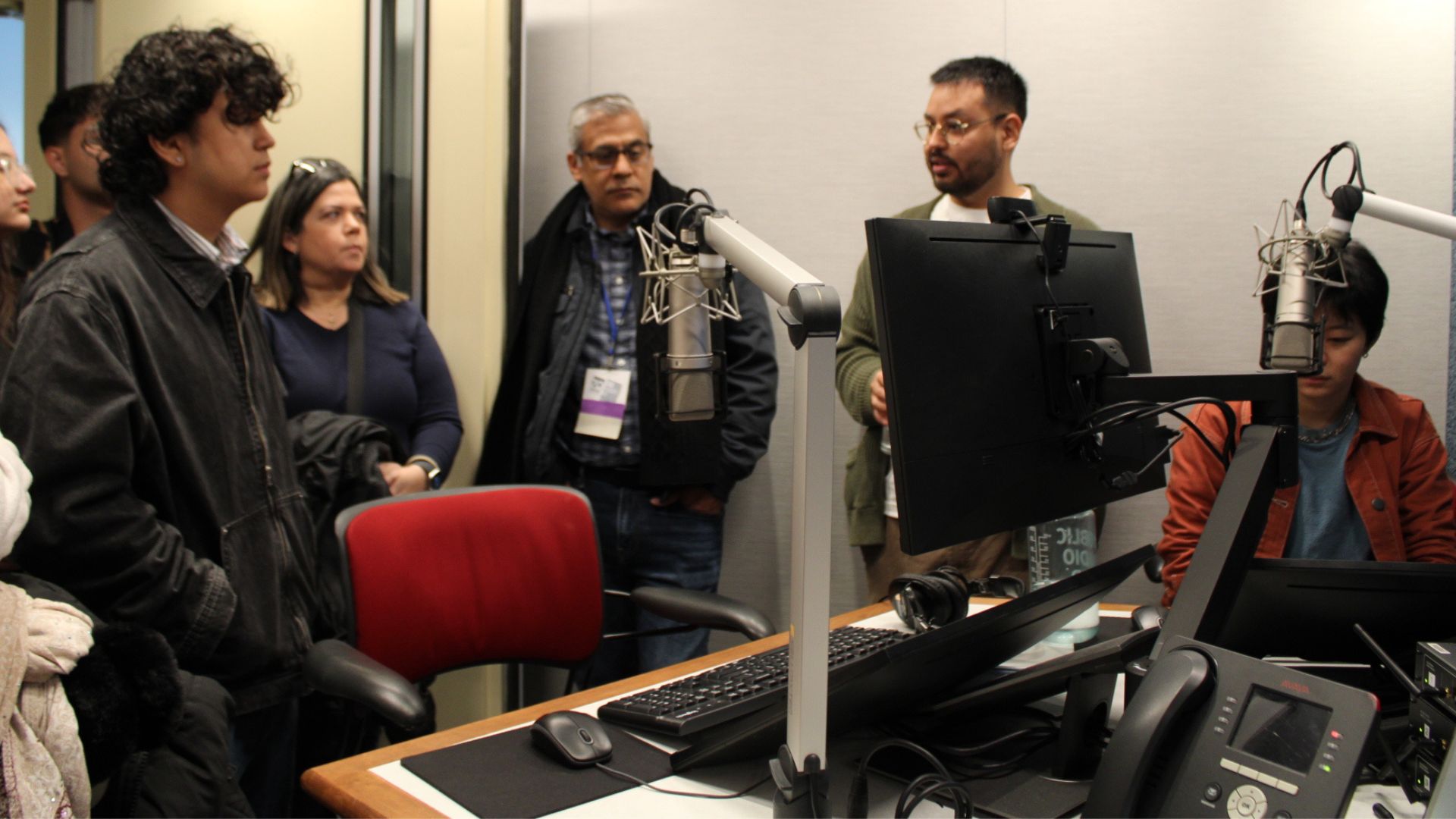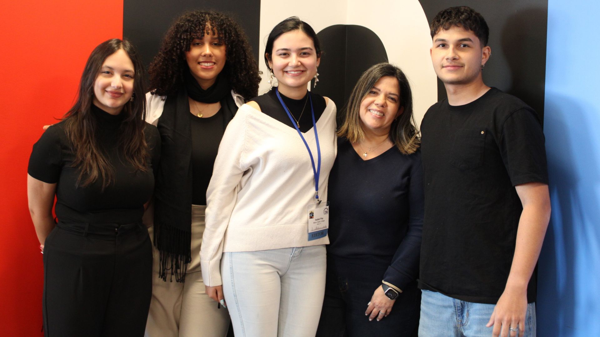 Teamwork: Pictured from left to right, at the National Public Radio office in New York City, are Victoria Cuellar, Ainhoa Osorio, Isabel Paz, Emily Sedin (adviser) and Michael Vargas of Kendall Campus’ student-led podcast platform: StoryBytes on Feb. 28. GEOVANNY MARCOS-PEDRO/THE REPORTER