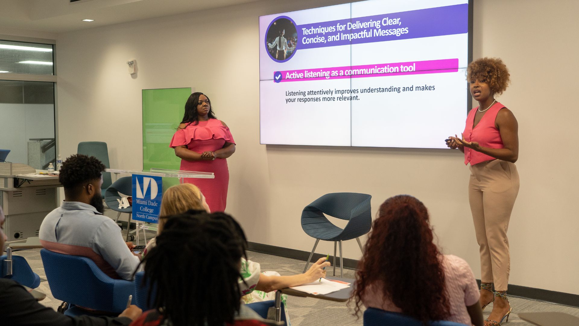Learning Tech: North Campus presented a Tech Talent Summit at the AI Center in the 1000 building on Nov. 6. Pictured from left to right are Genevieve Carvil Harris and La’Shondra Johnson who led one of the sessions called Mastering Business Communication and Body Language Beyond Your Interview. DEITY MONE’K/ THE REPORTER