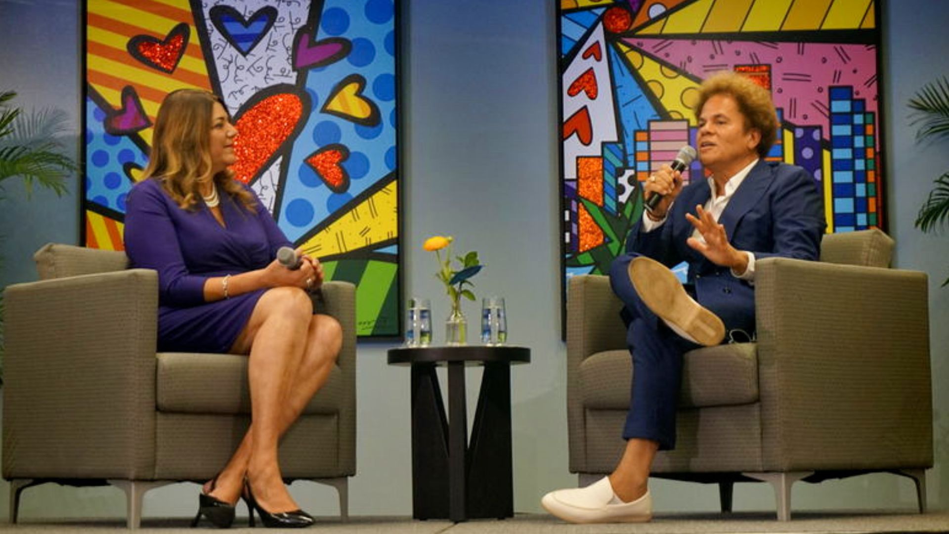 Art Talk: College President Madeline Pumariega hosts a conversation with Brazillain artist Romero Brito at Wolfson Campus on Sept. 17. ANGELINA CABRERA/THE REPORTER