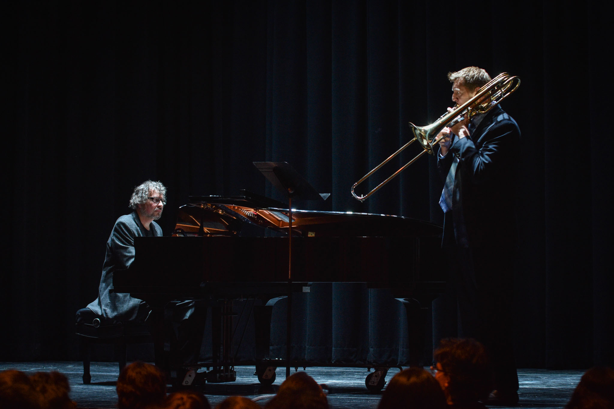 Dynamic Duo: Pianist Jim Gasior and trombonist Brent Mounger display their talents at the Wolfson Campus auditorium on Sept. 1 at the first New World School of the Arts Music Faculty Recital of the semester. BRIANNA ACEVEDO / THE REPORTER