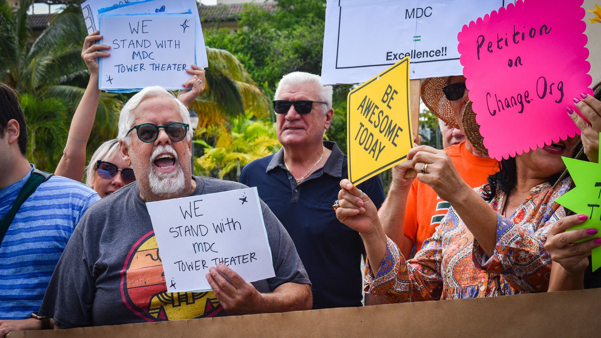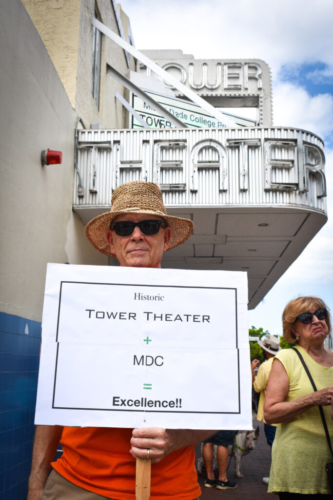 “It’s one of the few historic cinemas in the city,” said Molina, who led chants at the protest using a makeshift megaphone created from what appeared to be a poster board. “This isn’t the end of us fighting to keep the Tower under Miami Dade College.”