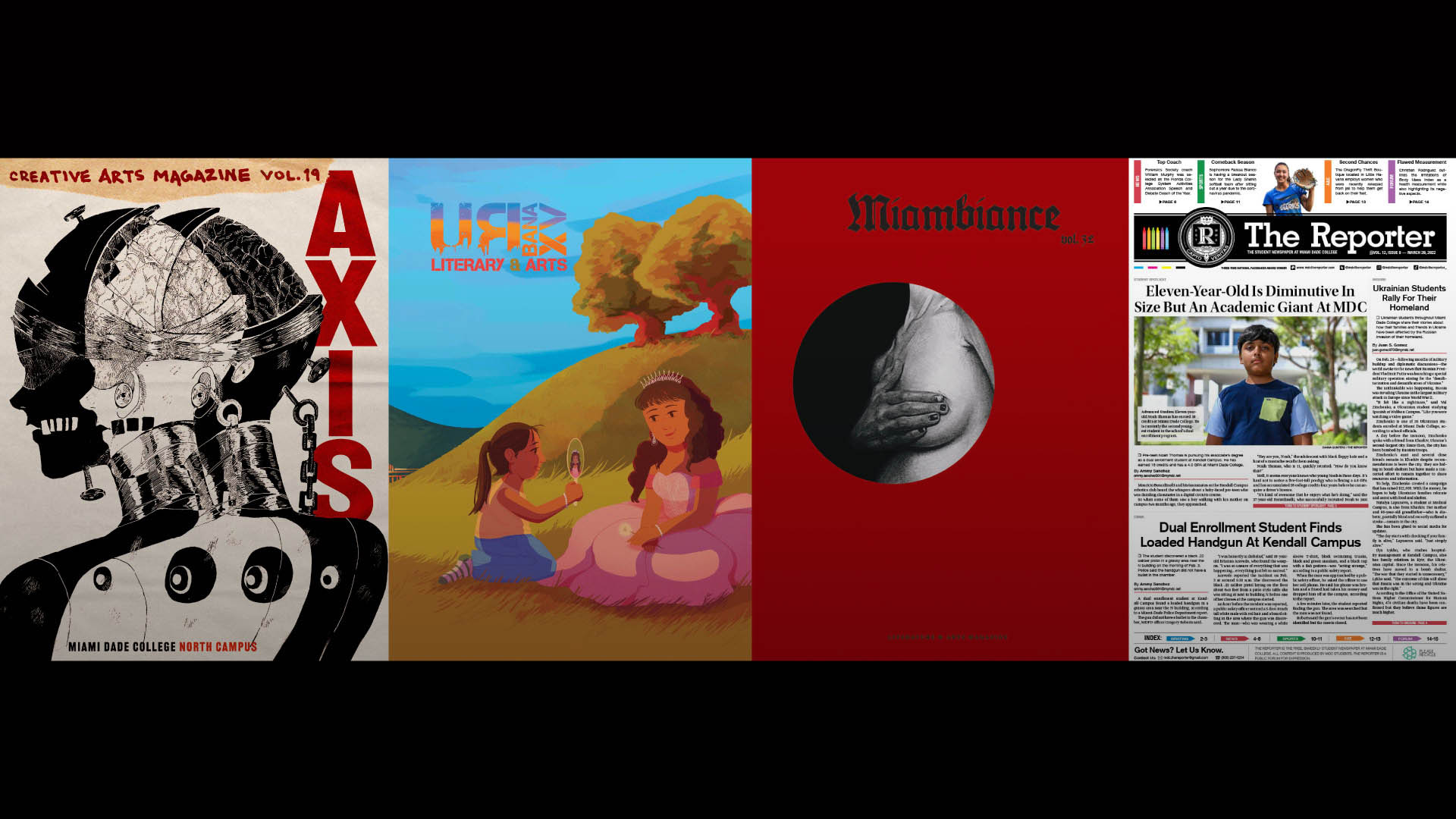 Four Miami Dade College student publications—AXIS, Urbana, Miambiance and The Reporter—have been selected as finalists for the prestigious Pacemaker award.