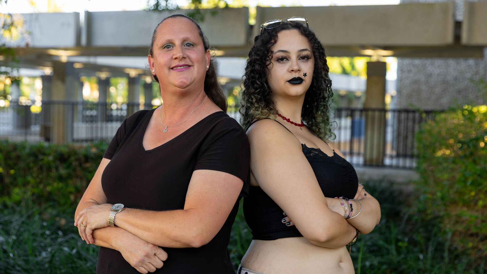 Alegría, on the other hand, opts for shark slides, yoga pants and T-shirts and sports her curly hair down. She often leans against the wall or stretches her feet onto a chair—until her mom gives her the side-eye.